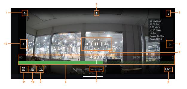 - Timeline – represents the recorded archive of the camera. Use to navigate forward or backward while viewing video playback.