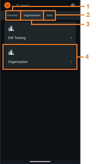 - Site/Organization Tiles – tap to select a Channel Partner, Organization, or Site while viewing a tab list.
