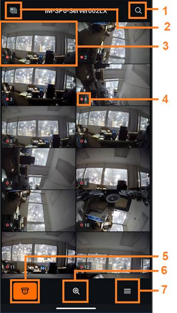 - Camera Preview – live camera streams are displayed in a grid layout. Live Preview viewing can be disabled in the local Settings menu of the application. Tap on a preview window to view a camera in a full screen display.