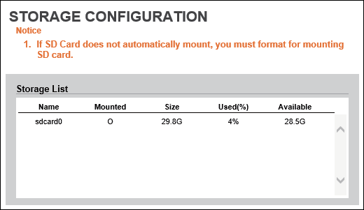 - Navigate to the Edge > Storage menu and select the mounted SD Memory Card from the Storage List.